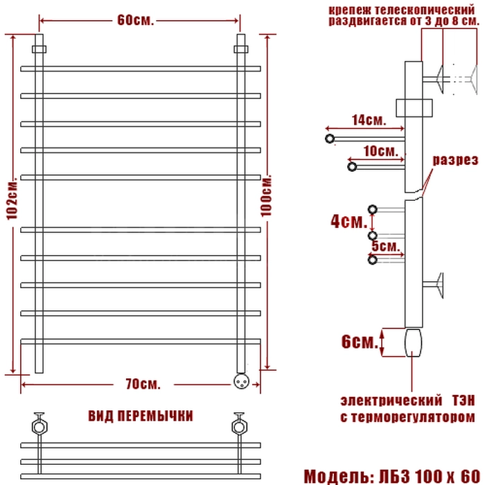 ЛБ3 – электрический полотенцесушитель без полки, но каждая горизонтальная перемычка выдвинута вперед больше предыдущей. Таким образом, верхняя перемычка, фактически, превращена в аналог полочки, так как она выступает вперед на 14,5см.