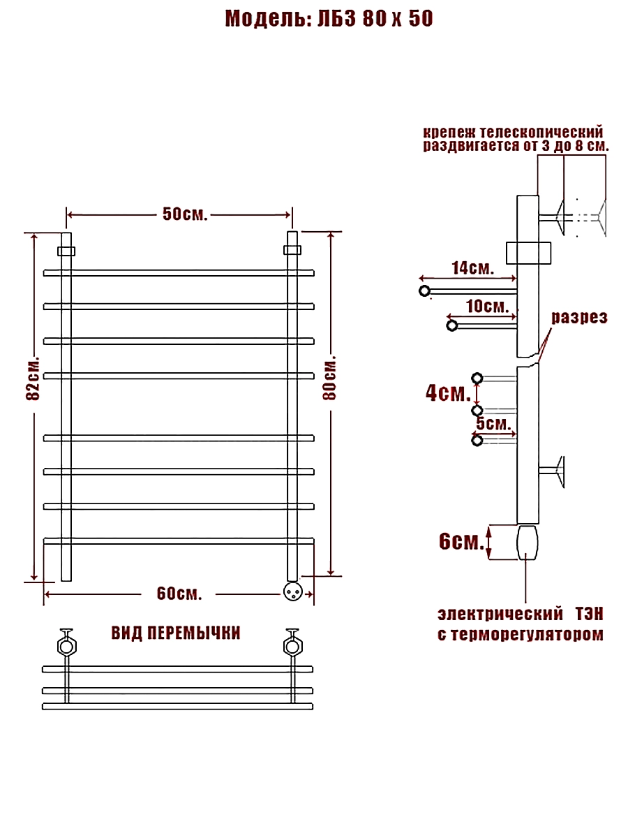 ЛБ3 – электрический полотенцесушитель без полки, но каждая горизонтальная перемычка выдвинута вперед больше предыдущей. Таким образом, верхняя перемычка, фактически, превращена в аналог полочки, так как она выступает вперед на 14,5см.