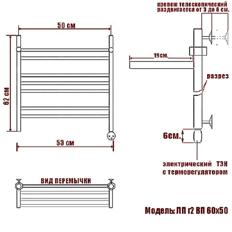 Электрический полотенцесушитель ЛП ВП имеет сдержанный лаконичный дизайн, компактные формы, верхнюю полку и обладает рядом технических преимуществ.