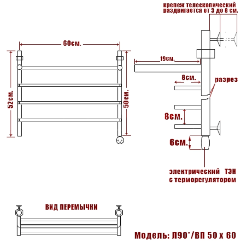 Электрический полотенцесушитель Л90 ВП имеет сдержанный лаконичный дизайн, компактные формы, верхнюю полку и обладает рядом технических преимуществ.