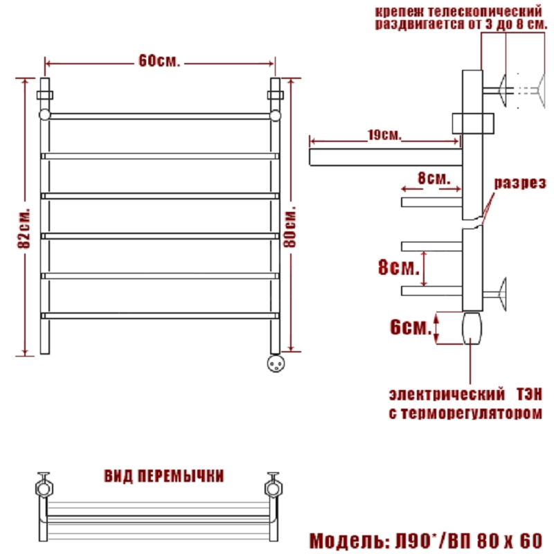 Электрический полотенцесушитель Л90 ВП имеет сдержанный лаконичный дизайн, компактные формы, верхнюю полку и обладает рядом технических преимуществ.