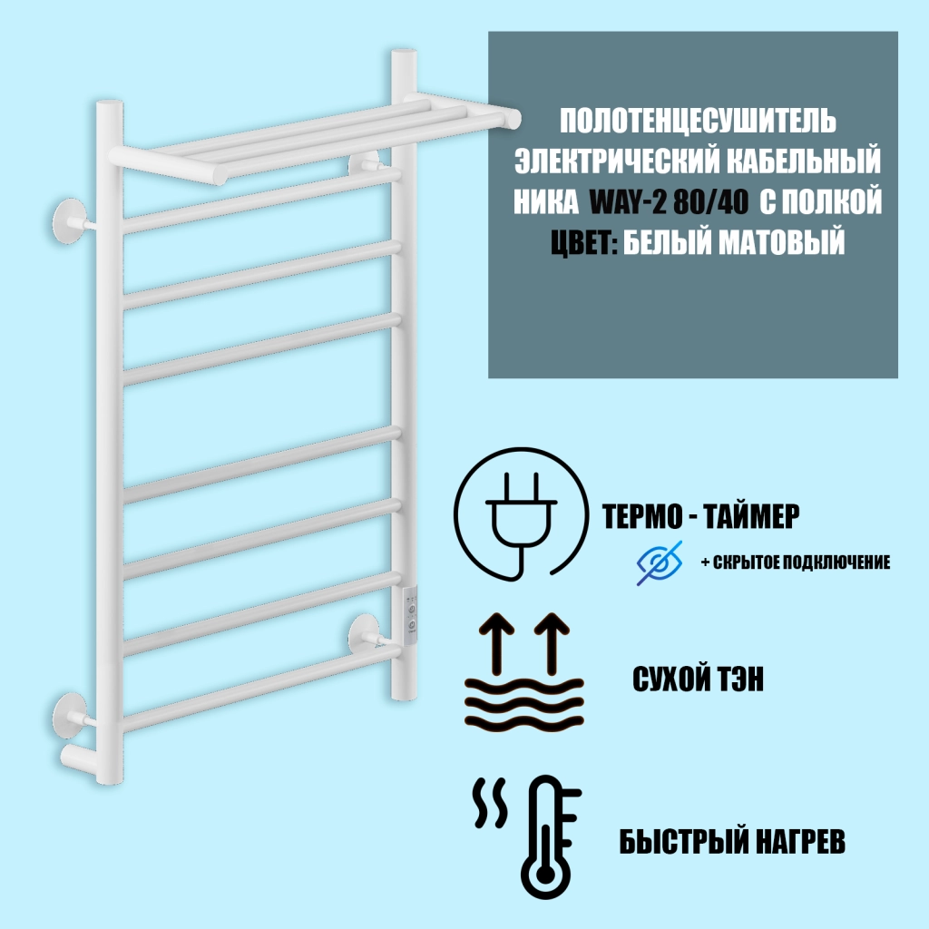 Полотенцесушитель электрическийкабельный Ника WAY-2 80/40 с полкой RAL9016 белый матовый U