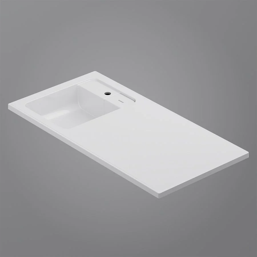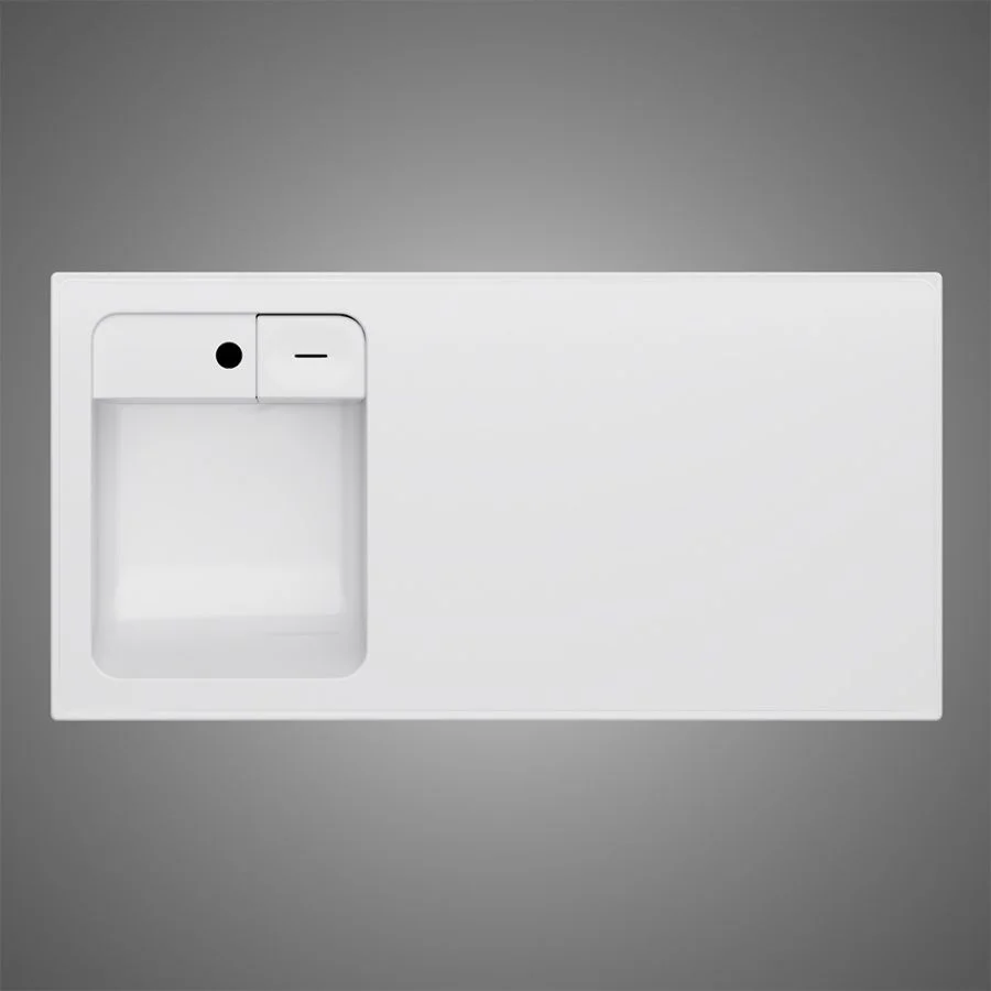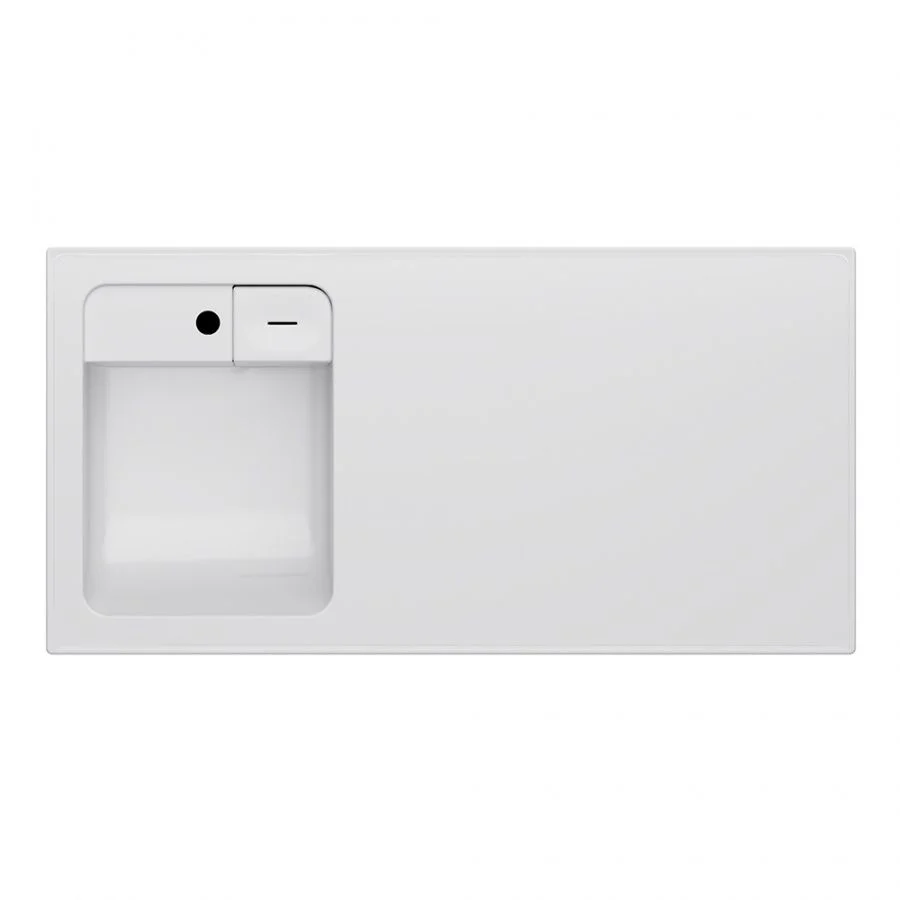 Дизайнерская раковина из литьевого мрамора белоснежного цвета с бортиком скрытым сливом и съемной мыльницей. Раковина оснащена просторной столешницей на которой можно разместить косметические и гигиенические средства. Столешница защищает стиральную машину от повреждений и механических воздействий.