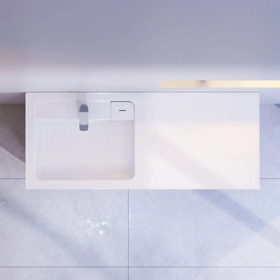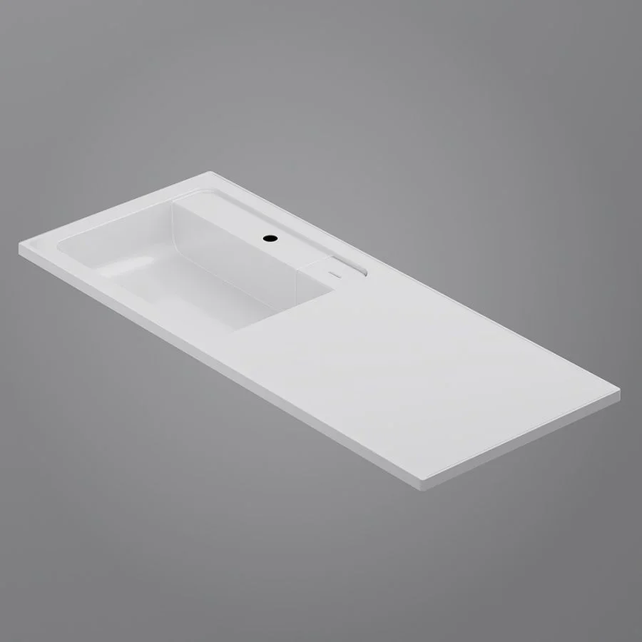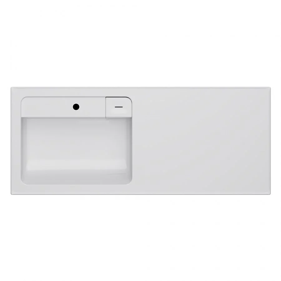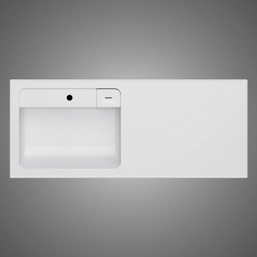 Дизайнерская раковина из литьевого мрамора белоснежного цвета с бортиком скрытым сливом и съемной мыльницей. Раковина оснащена просторной столешницей на которой можно разместить косметические и гигиенические средства. Столешница защищает стиральную машину от повреждений и механических воздействий.