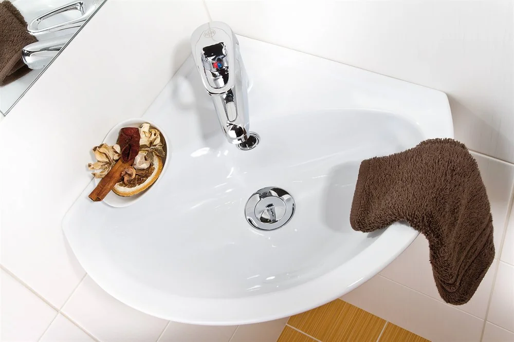 Угловая, подвесная раковина Teta, размером 43 см. Имеет отверстие под смеситель, а также отверстие перелива.