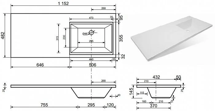 Раковина Эстет Даллас ФР-00001937 правая 1150х480 накладная