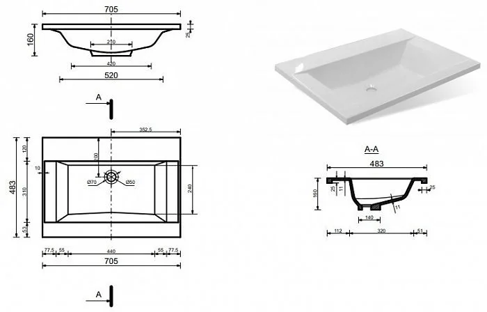 Раковина Эстет Рава 70 ФР-00002612 700х480 накладная (арт. ФР-00002612, раковина).
