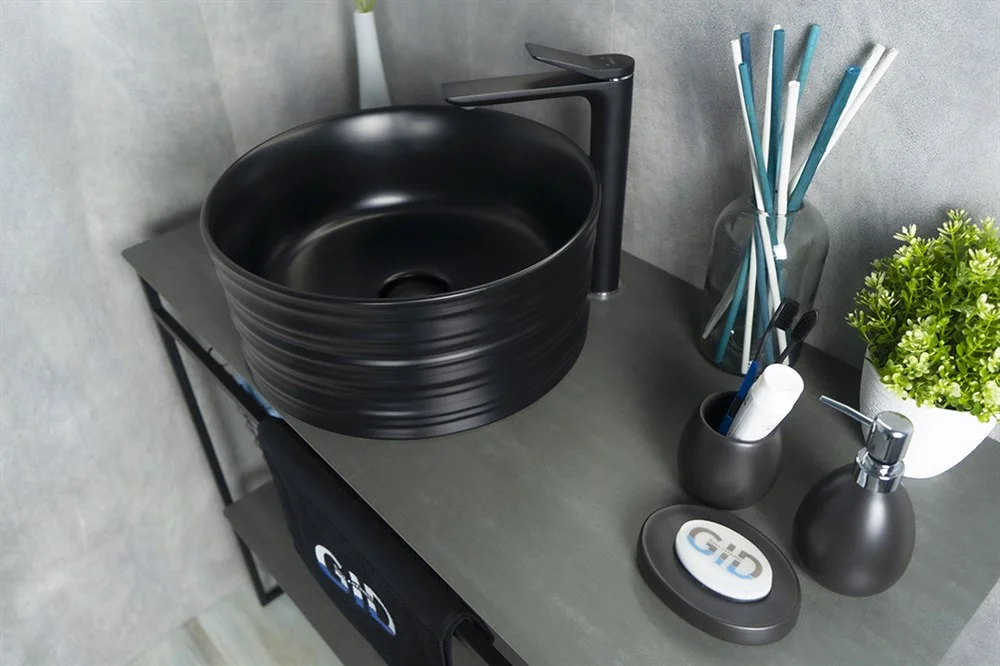 Керамическая раковина Gid Bm969 снаружи имеет рифленую поверхность, а черный матовый окрас не оставит равнодушным любого дизайнера.