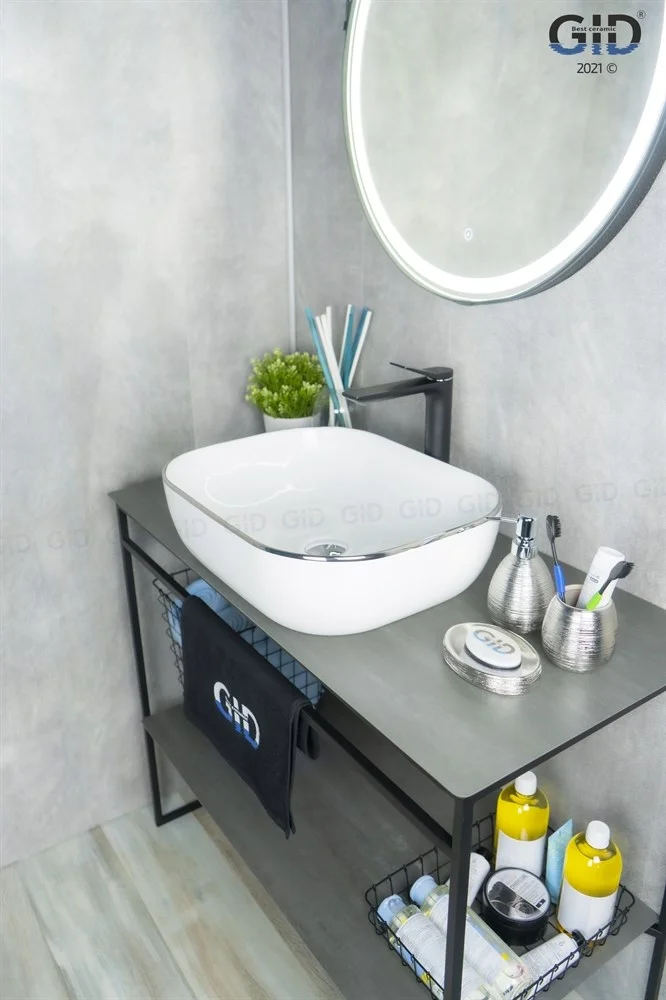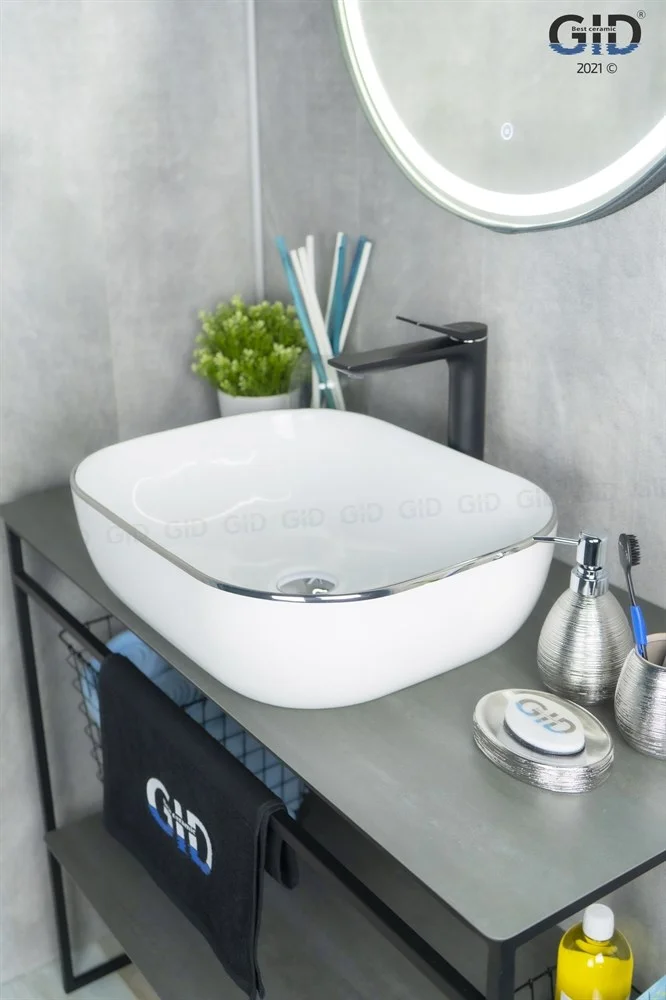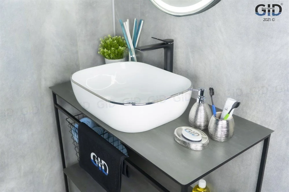 Дизайнерская раковина Gid D1302h011 покрыта класической белой глазурью, а серебряная окантовка делает её более привлекательной.