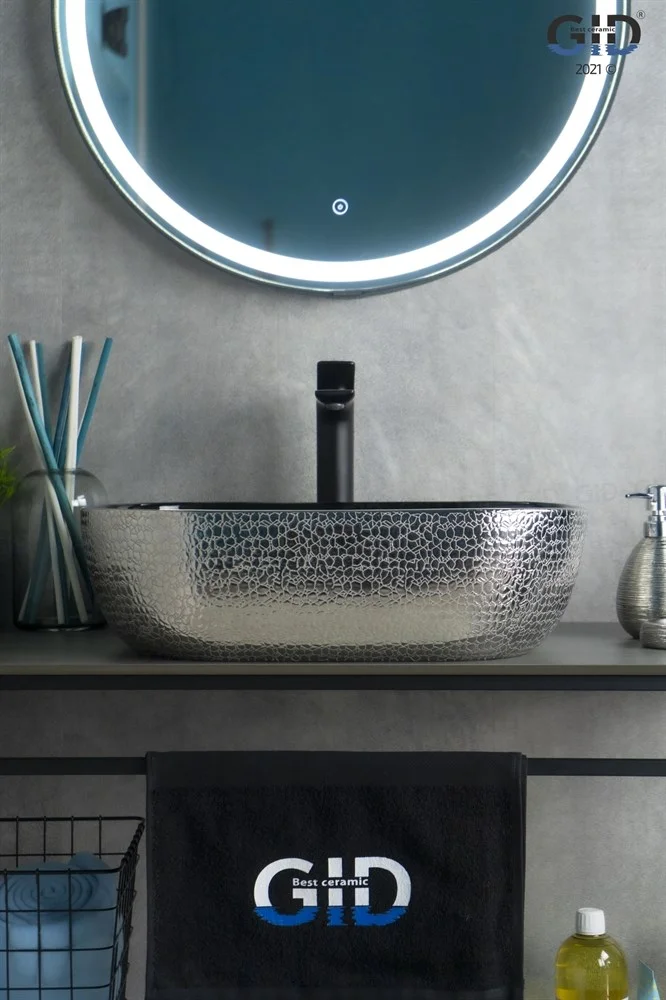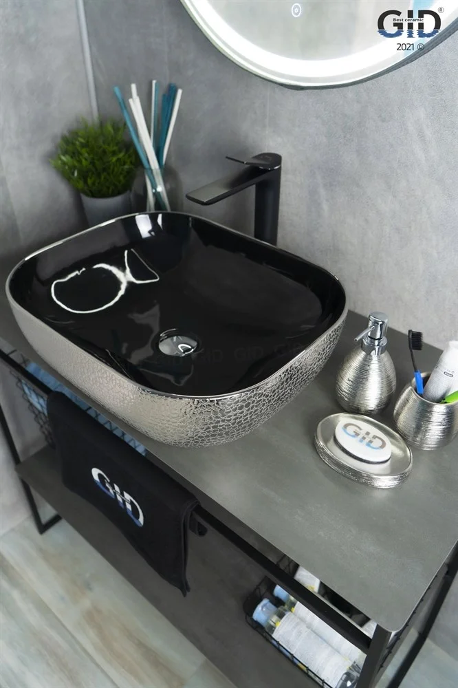 Дизайнерская раковина Gid D1302h020 покрыта снаружи кожаной фактурой серебряного цвета, а внутренняя часть черной глазурью.