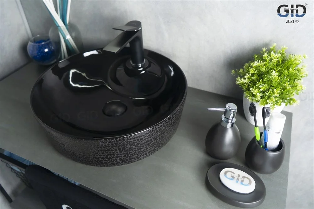 Дизайнерская раковина Gid D1306h004 с отверстием под смеситель имеет круглую форму, а снаружи покрыта кожаной фактурой черного цвета.
