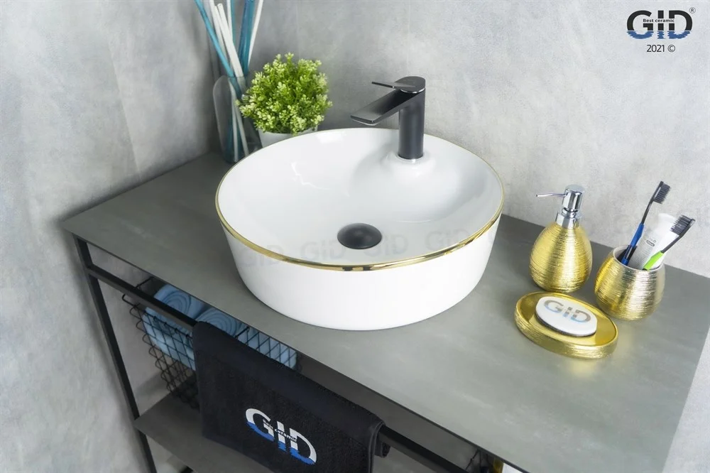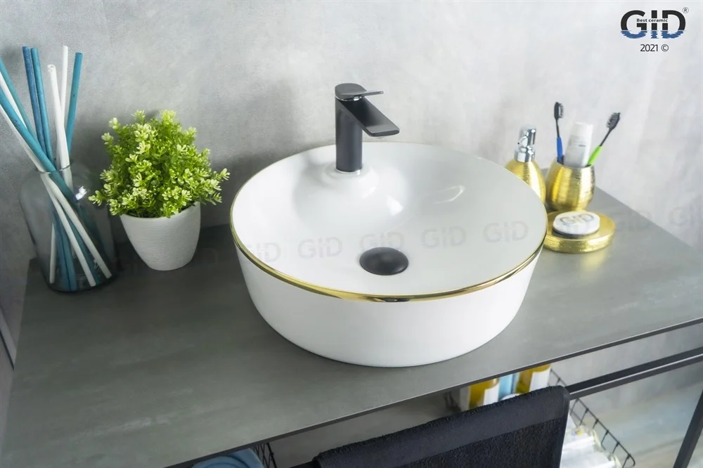 Дизайнерская раковина Gid D1306h011 имеет круглую форму. Чаша покрыта класической белой глазурью, а золотая окантовка делает её более привлекательной.