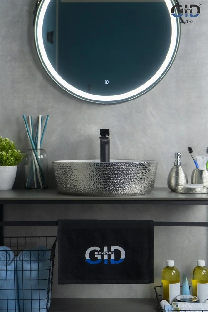 Дизайнерская раковина Gid D1306h021 с отверстием под смеситель имеет круглую форму. Чаша покрыта снаружи кожаной фактурой серебряного цвета, а внутренняя часть класической белой глазурью.