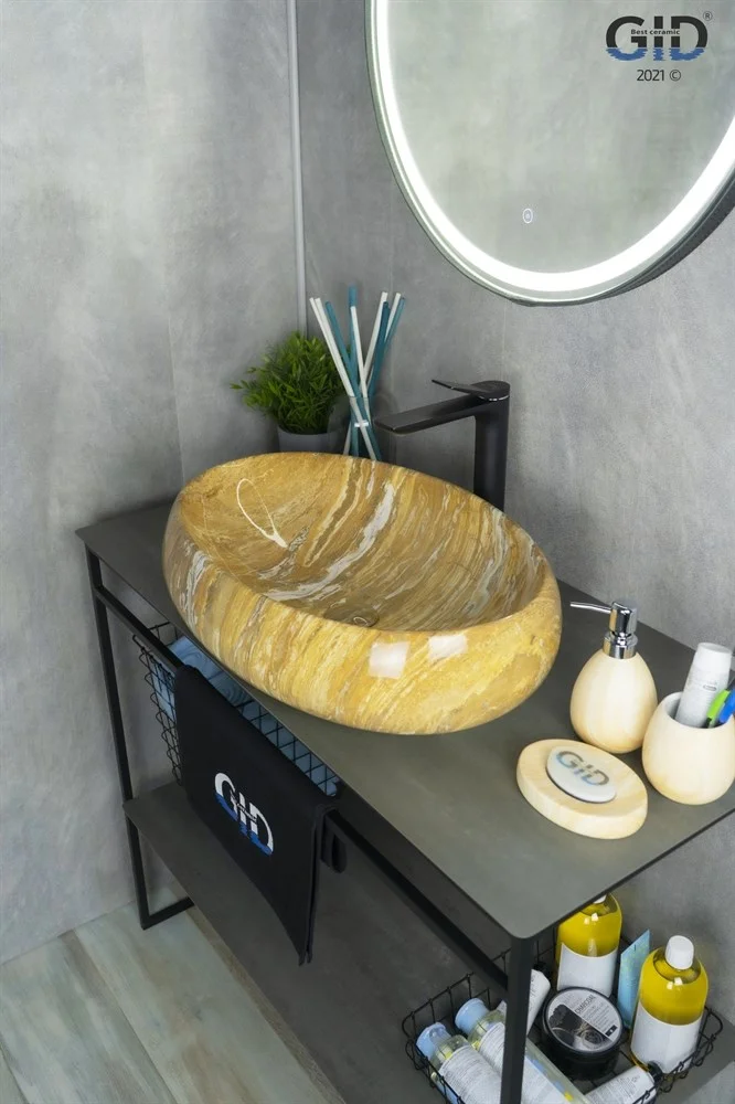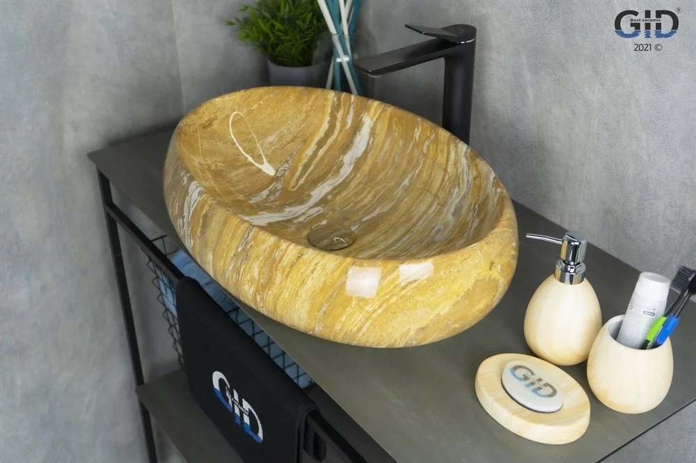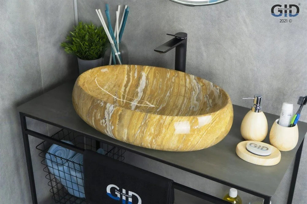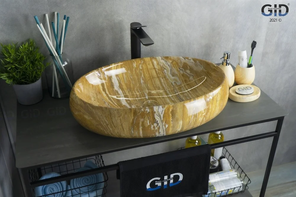 Керамическая дизайнерская раковина Gid Mnc164 покрыта каменной фактурой коричневого оттенка с прожилками путём современных высокотехнологических процессов.