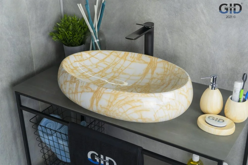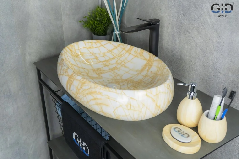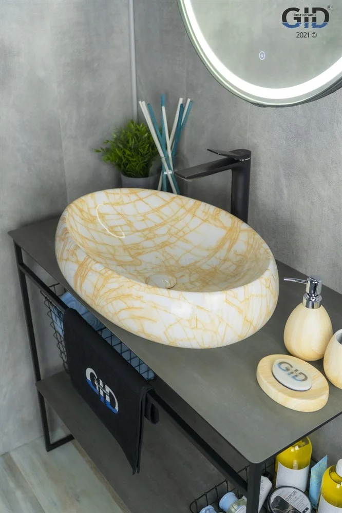 Керамическая дизайнерская раковина Gid Mnc167 покрыта каменной фактурой с оранжевыми прожилками путём современных высокотехнологических процессов.