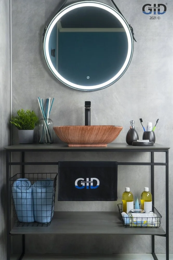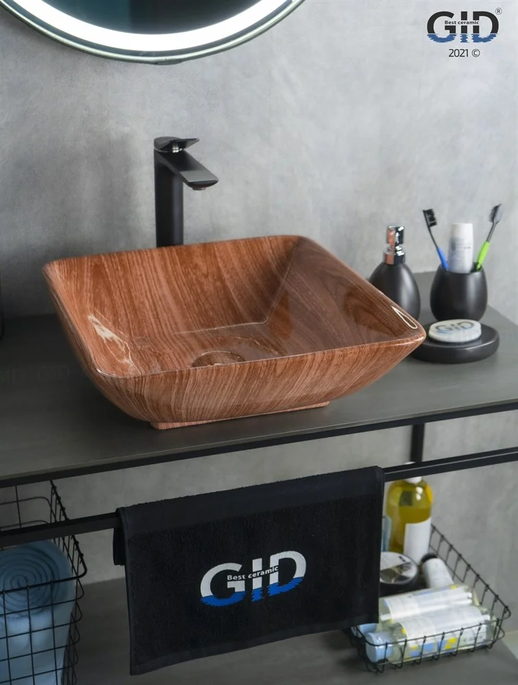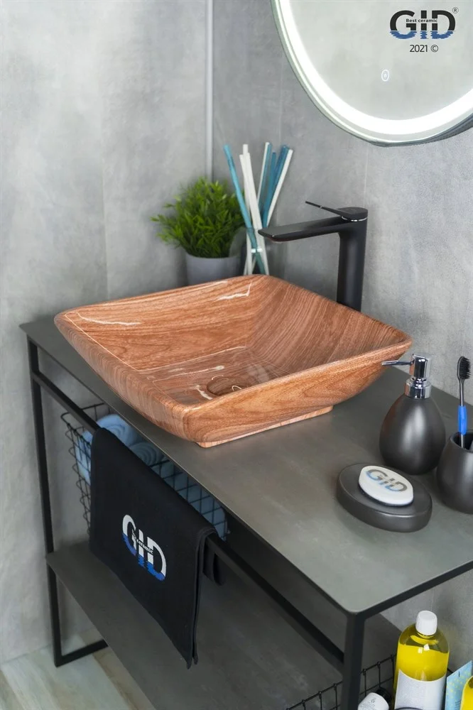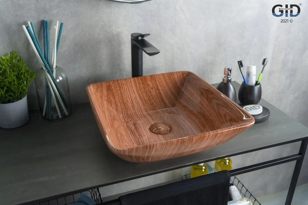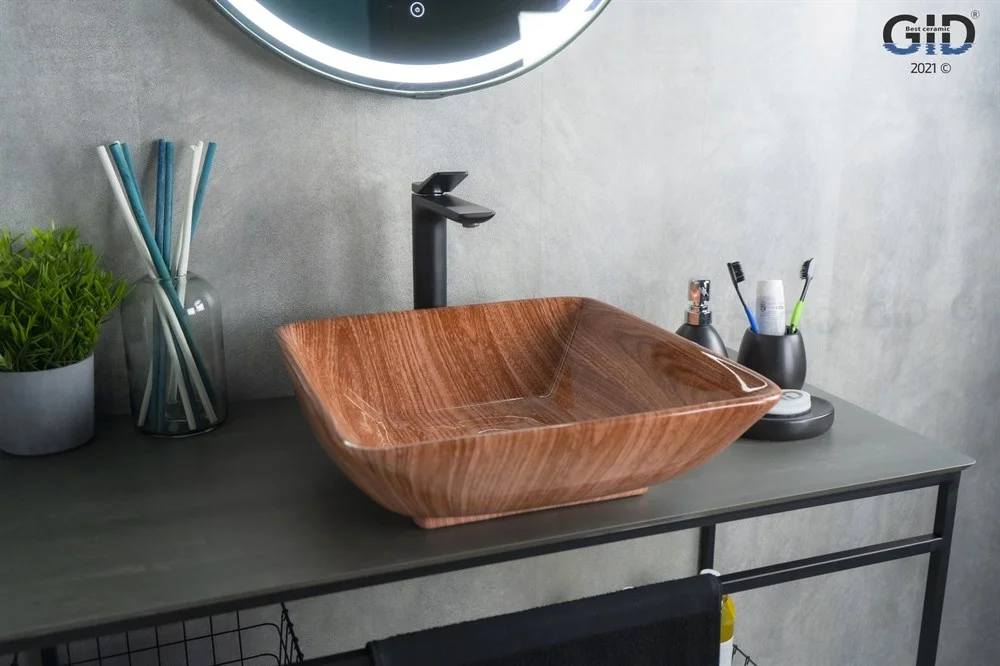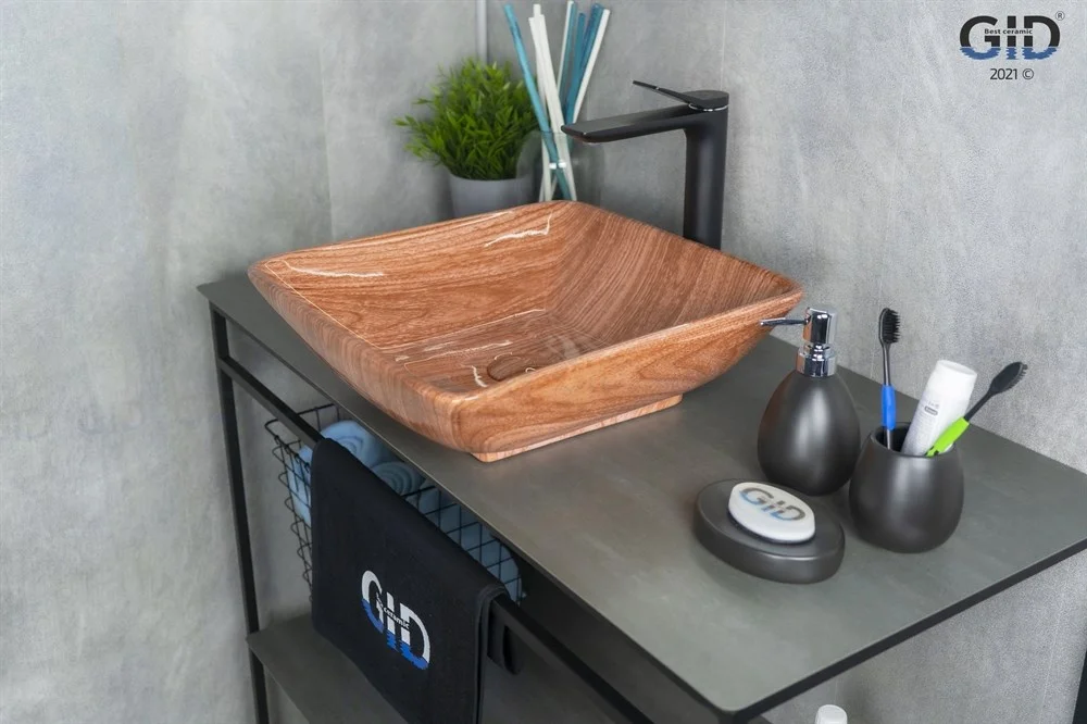 Керамическая дизайнерская раковина Gid Mnc180 покрыта каменной фактурой деревянного оттенка путём современных высокотехнологических процессов.