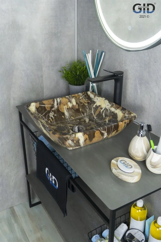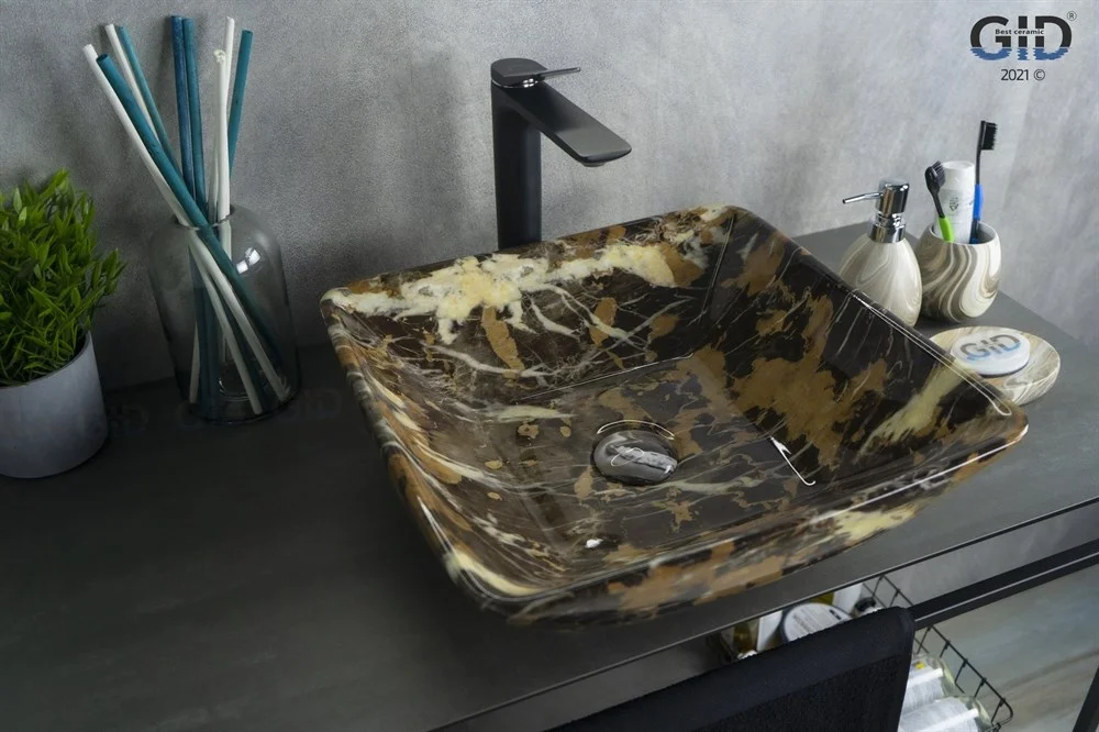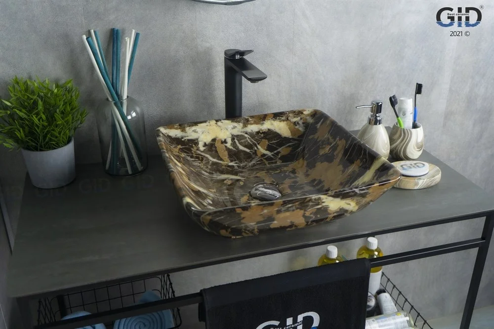 Керамическая дизайнерская раковина Gid Mnc183 покрыта каменной фактурой коричневого оттенка со светлыми прожилками путём современных высокотехнологических процессов.