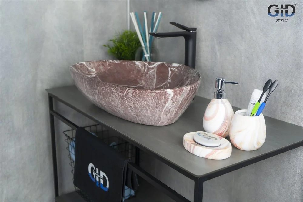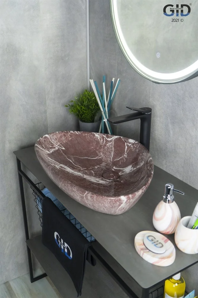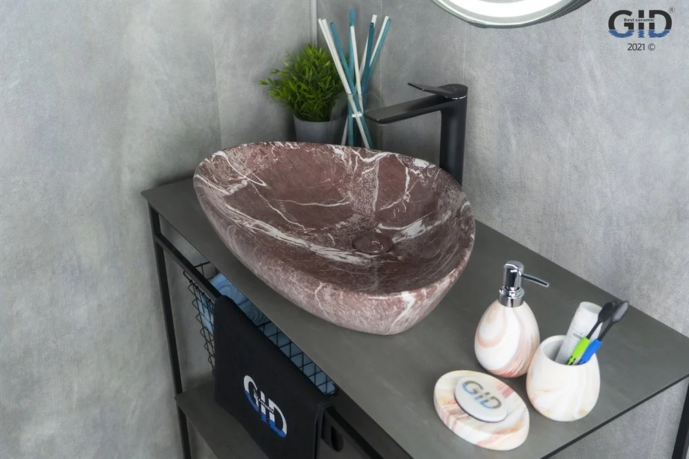Керамическая дизайнерская раковина Gid Mnc208 покрыта каменной фактурой красного оттенка с белыми прожилками путём современных высокотехнологических процессов.