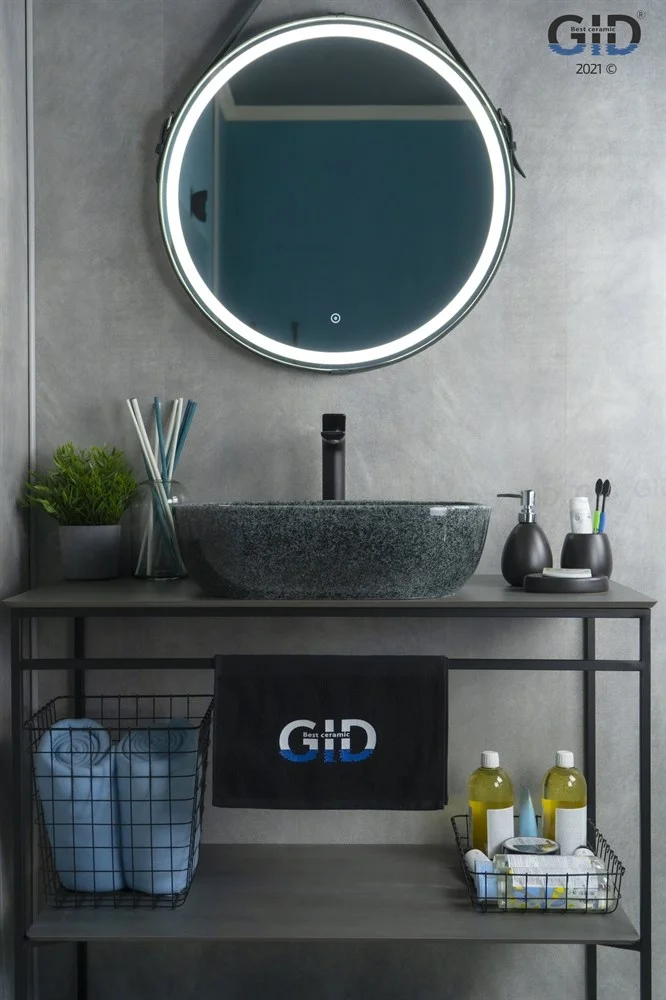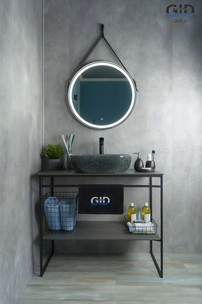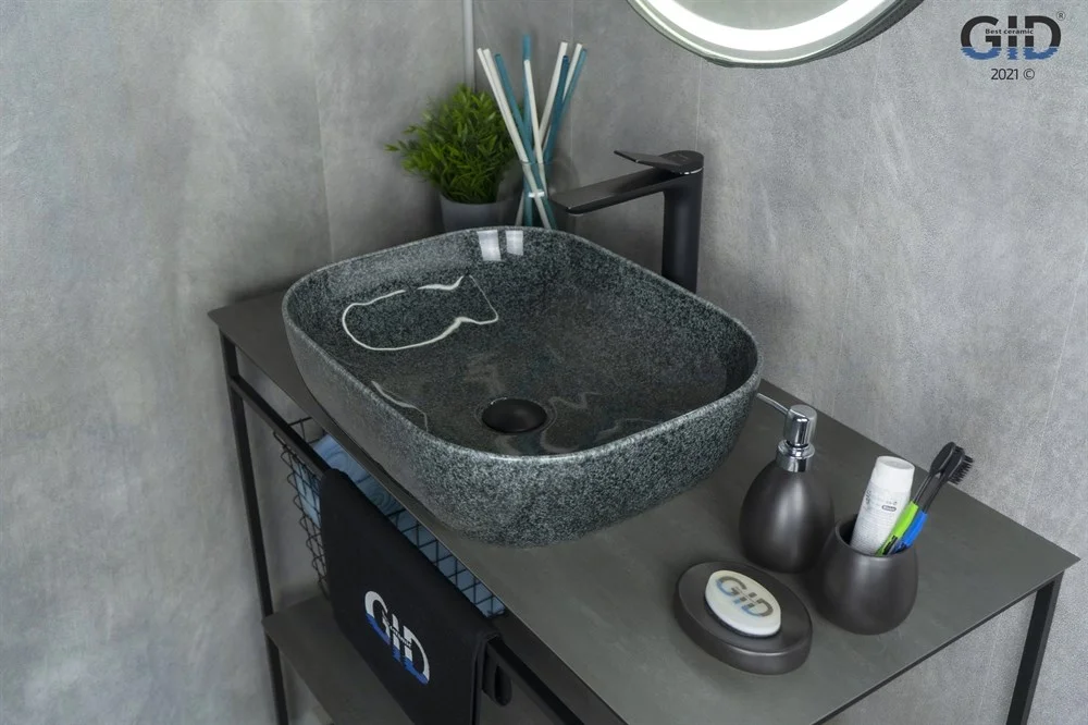 Керамическая дизайнерская раковина Gid Mnc338 покрыта каменной фактурой серого оттенка путём современных высокотехнологических процессов.