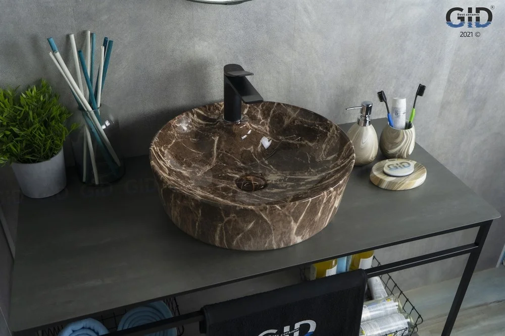 Керамическая дизайнерская раковина Gid Mnc536 покрыта каменной фактурой бордовых оттенков со светлыми прожилками путём современных высокотехнологических процессов.