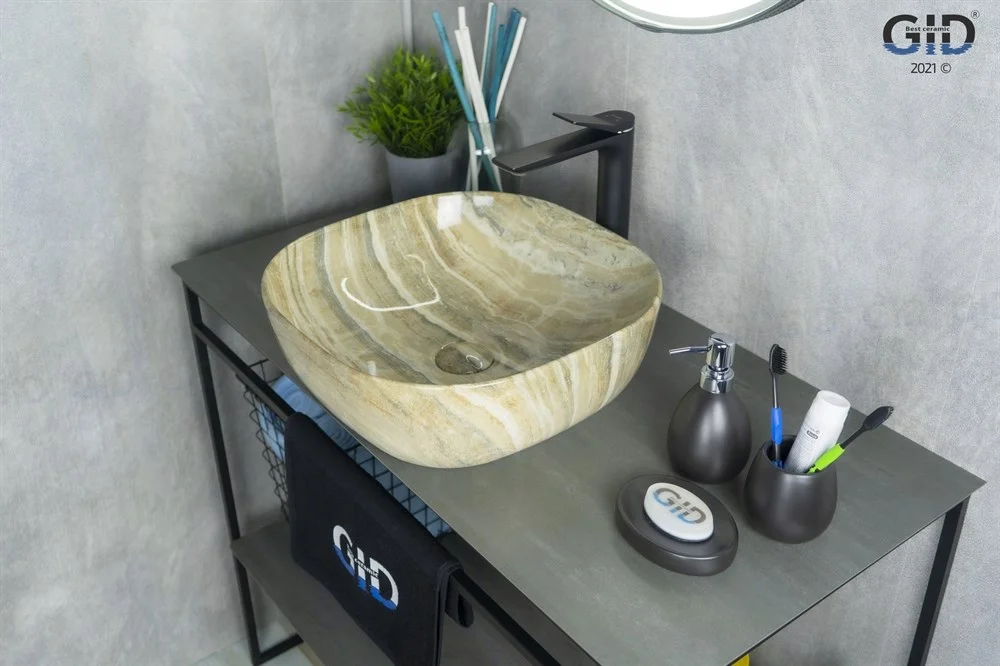 Керамическая дизайнерская раковина Gid Mnc543 покрыта каменной фактурой коричневых оттенков с прожилками путём современных высокотехнологических процессов.