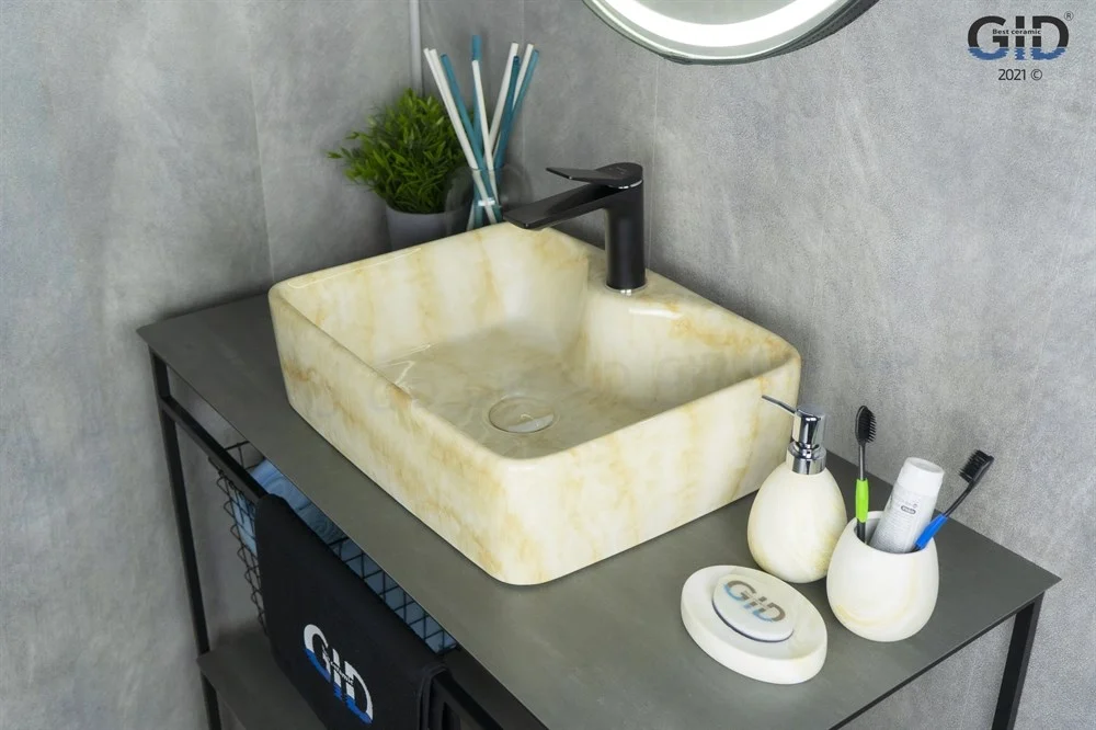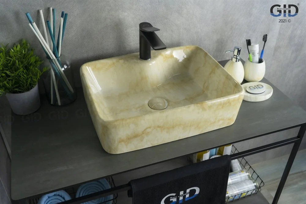 Керамическая дизайнерская раковина Gid Mnc606 покрыта каменной фактурой желтых оттенков путём современных высокотехнологических процессов.