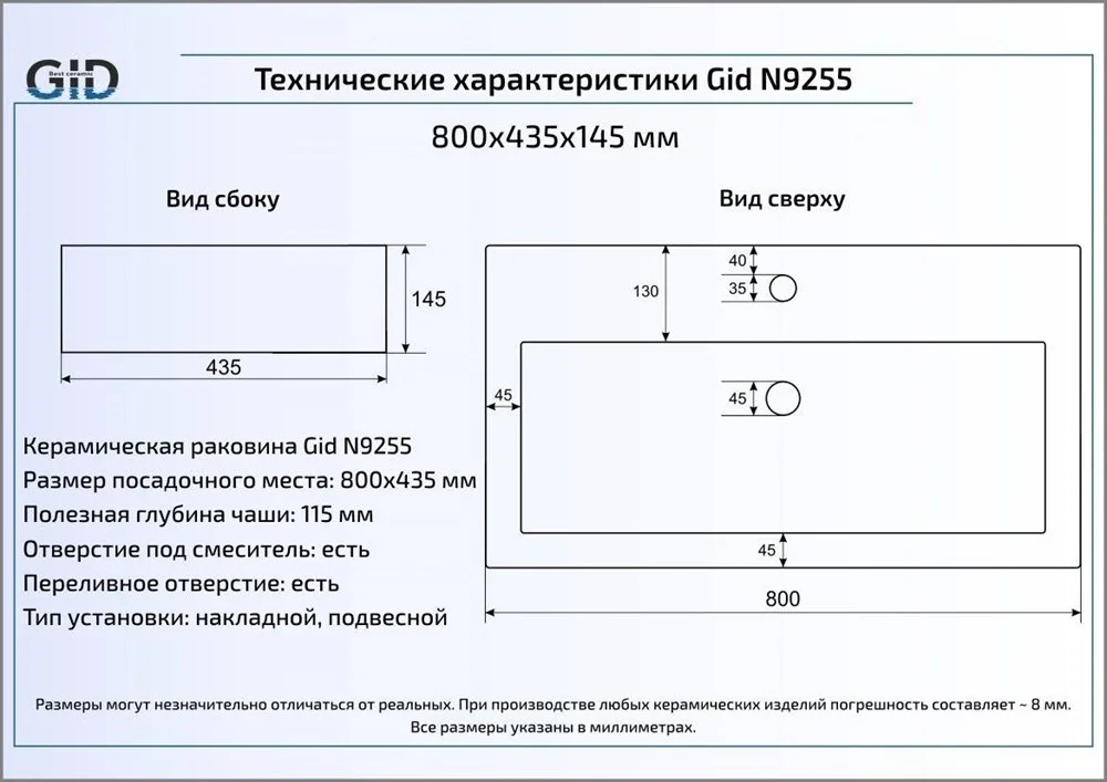 Раковина для ванной Gid N9255 монтируется на столешницу или мебель.