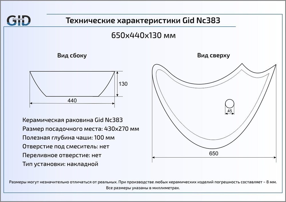 Раковина для ванной Gid Nc383 монтируется на столешницу или мебель.