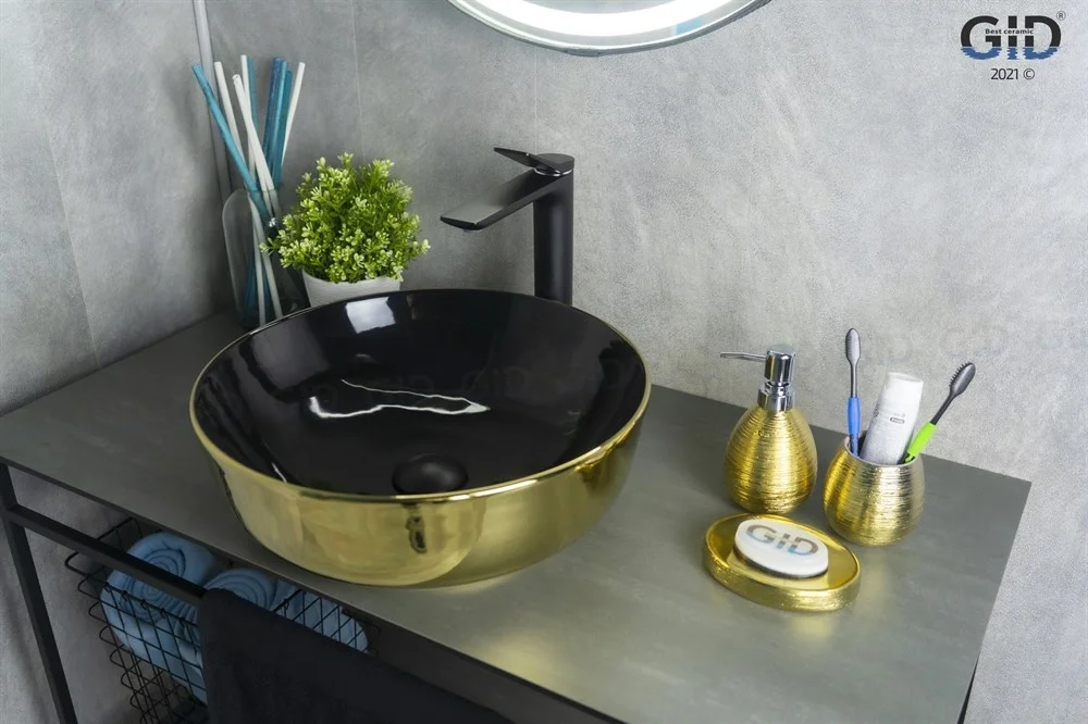 Внешняя поверхность дизайнерской раковины Gid Nc412 покрыта золотым глянцевым цветом, а внутренняя часть чаши - черным. Отличный выбор для тех, кто ищет круглую раковину необычного оттенка.