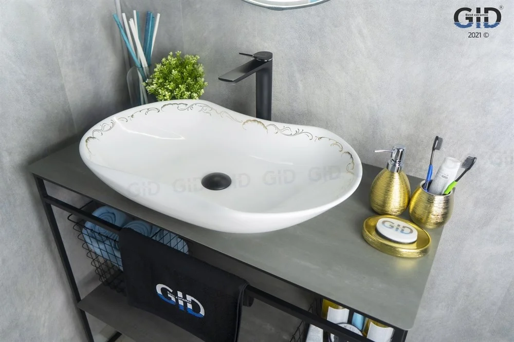 Поверхность дизайнерской раковины Gid Nc460 покрыта классической белой глазурью, а так же дизайнерской золотой росписью.