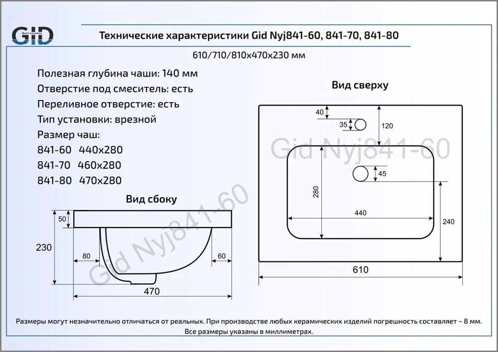 Раковина для ванной Gid Nyj841-70 монтируется в столешницу.