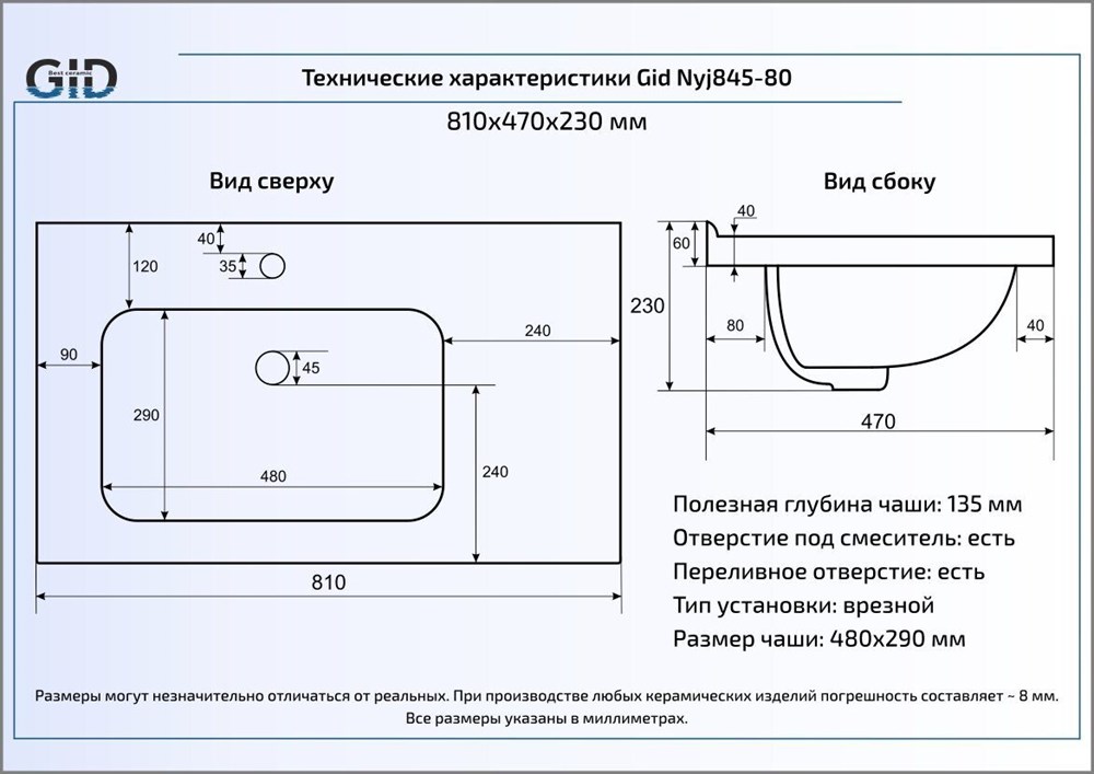 Раковина для ванной Gid Nyj845-80 монтируется в столешницу.