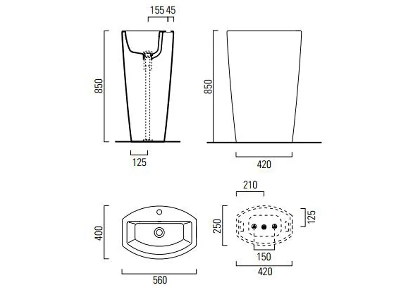 Установка в центре комнаты со сливом в пол (крепеж включен). Размер - 56х40х85 см. Цвет - белый глянцевый.