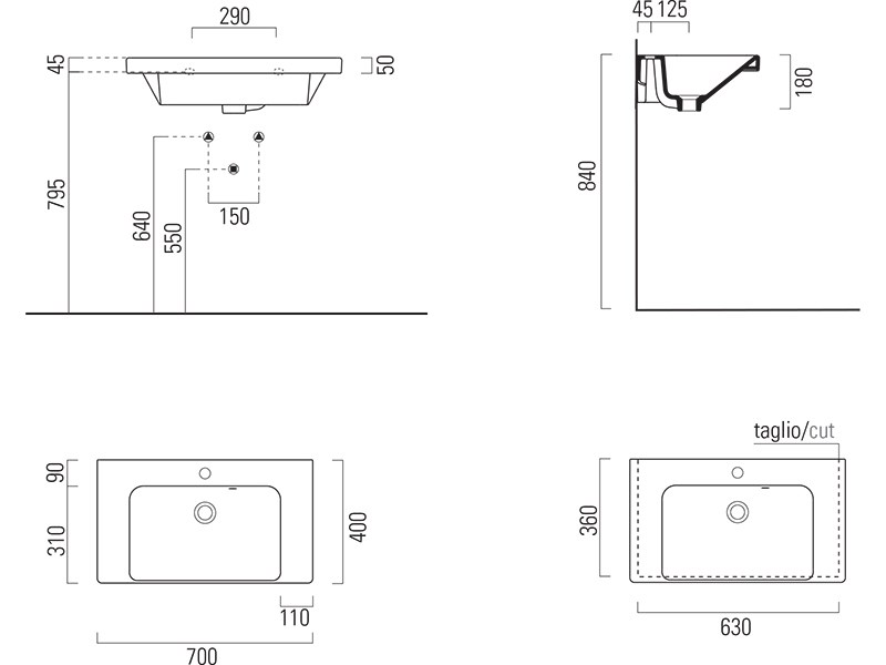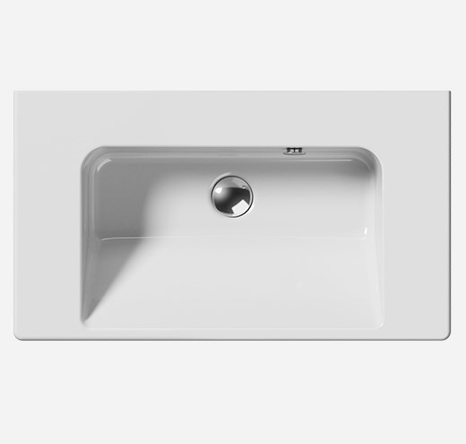 Раковина с переливом, 1 отверстие для смесителя. Установка - навесная или встроенная. Размер - 70х40х18 см. Цвет - белый глянцевый.