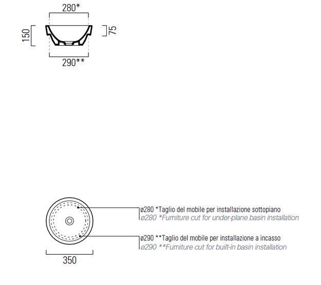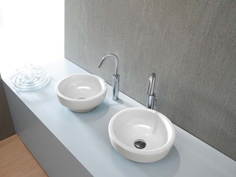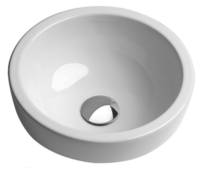 Раковина без перелива, предназначена для смесителя со стены или со столешницы. Установка - накладная, встроенная в столешницу или встроенная под столешницу. Диаметр - 35 см, высота - 15 см. Цвет - белый.