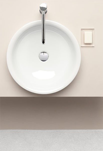 Раковина накладная без перелива, смеситель со стены или столешницы. Размер D=42 Р=14. Цвет белый глянцевый.