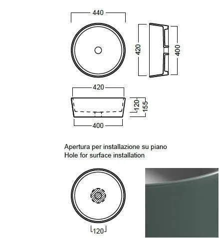 Раковина накладная на 44 см Hatria Happy Hour 07:00 Y1A218. Умывальник без плоскости под смеситель; без отверстия перелива. Устанавливается на столешницу. Цв. раковины темно-зеленый снаружи, белый изнутри.
