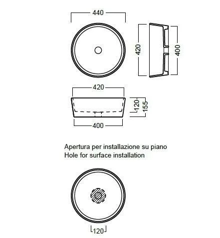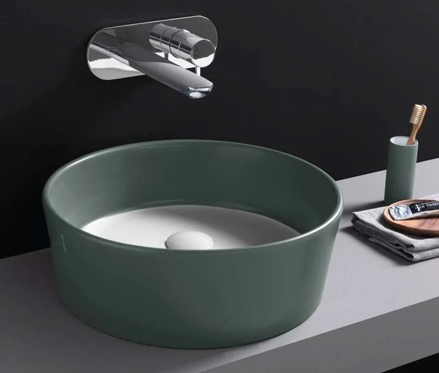 Раковина накладная на 44 см Hatria Happy Hour 07:00 Y1A388. Умывальник без плоскости под смеситель; без отверстия перелива. Устанавливается на столешницу. Цв. раковины темно-зеленый с белым дном.