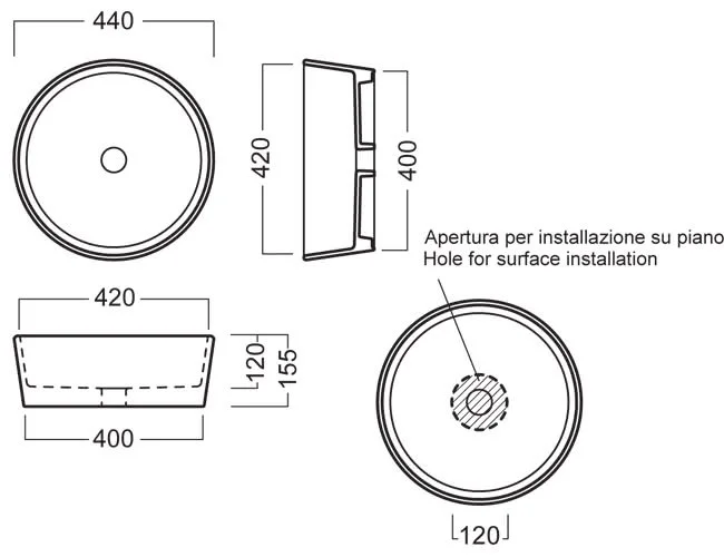 Hatria Happy Hour 07:00 YXSK01 - Раковина чаша накладная Ø 44 см, монтаж на плоскость столешницы - сверху, без отверстия для смесителя, без перелива.