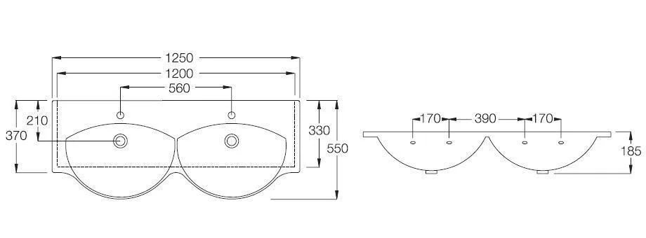 Раковина двойная на 125 см HATRIA SOPHIE Y0Q501. Умывальник с двумя центральными отверстиями под смеситель, с отверстиями перелива; укомплектован крепежными элементами. Монтируется на стену, или мебель. Производитель Италия "HATRIA".