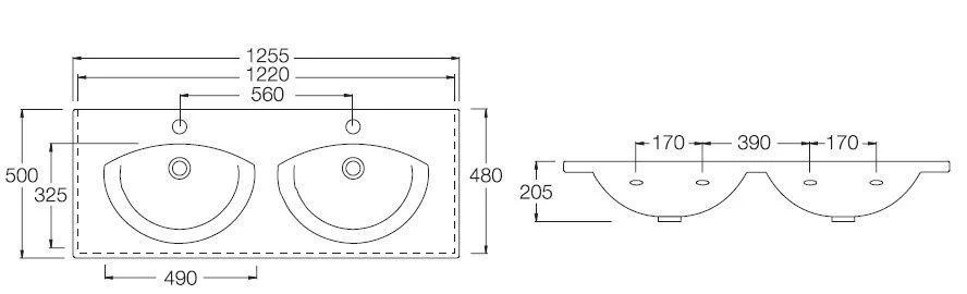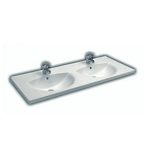 Раковина двойная на 125 см HATRIA SUSAN Y0HP01. Умывальник с двумя центральными отверстиями под смеситель; с отверстием перелива. Устанавливается на стены с помощью крепежа, возможен монтаж на мебель, столешницы и подстолья. Производитель Италия "HATRIA".