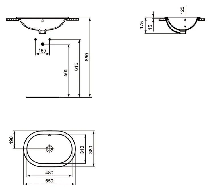 CONNECT Овальный встраиваемый умывальник 55X38 см, без отверстия под смеситель, с отверстием перелива, с монтажным шаблоном, без крепежа