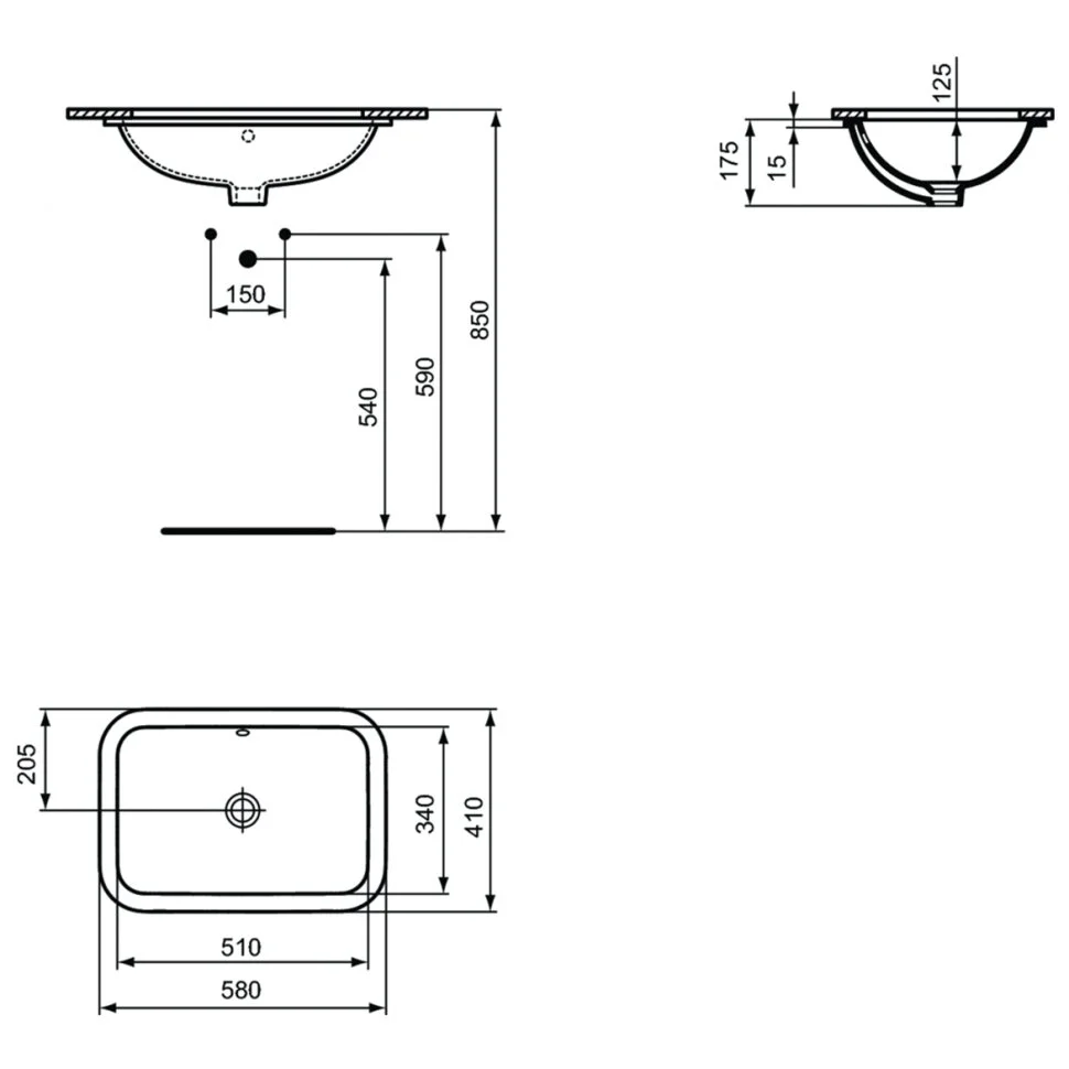 CONNECT Прямоугольный встраиваемый под столешницу умывальник 58 см, без отверстия под смеситель, с отверстием перелива, с монтажным шаблоном, с крепежом T645567
