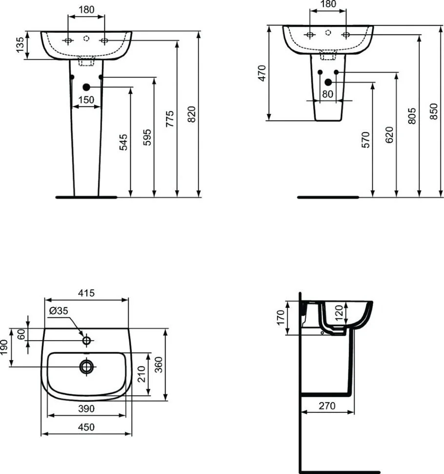 ESEDRA Guest Умывальник 45X36 см с 1-м отверстием под смеситель, с отверстием перелива, без крепежа, для монтажа с колонной (Guest T290401), полуколонной (Guest T290301) или дизайн-сифоном