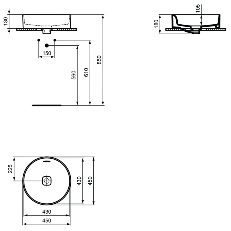STRADA II Round Vessel Умывальник 45 см без отверстия под смеситель, для монтажа с мебелью, с отверстием перелива (щелевого типа), с керамической накладкой слива (T854601), с крепежом