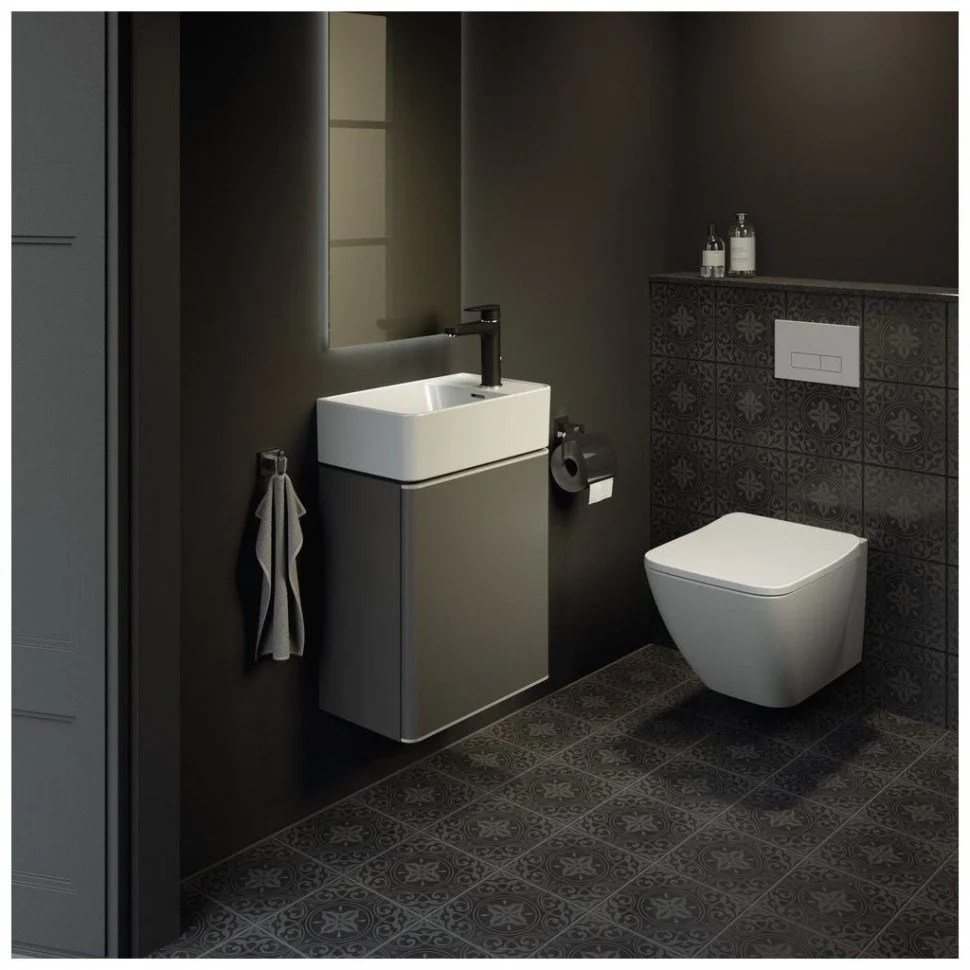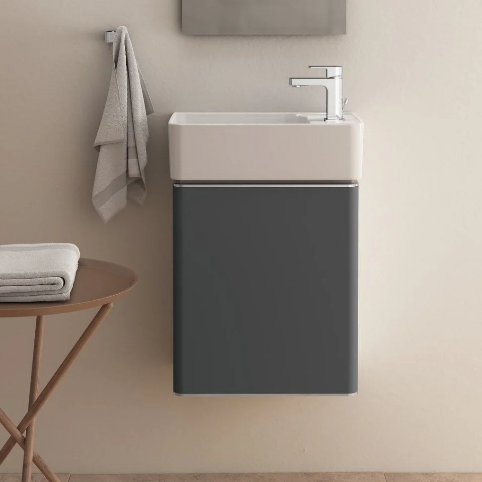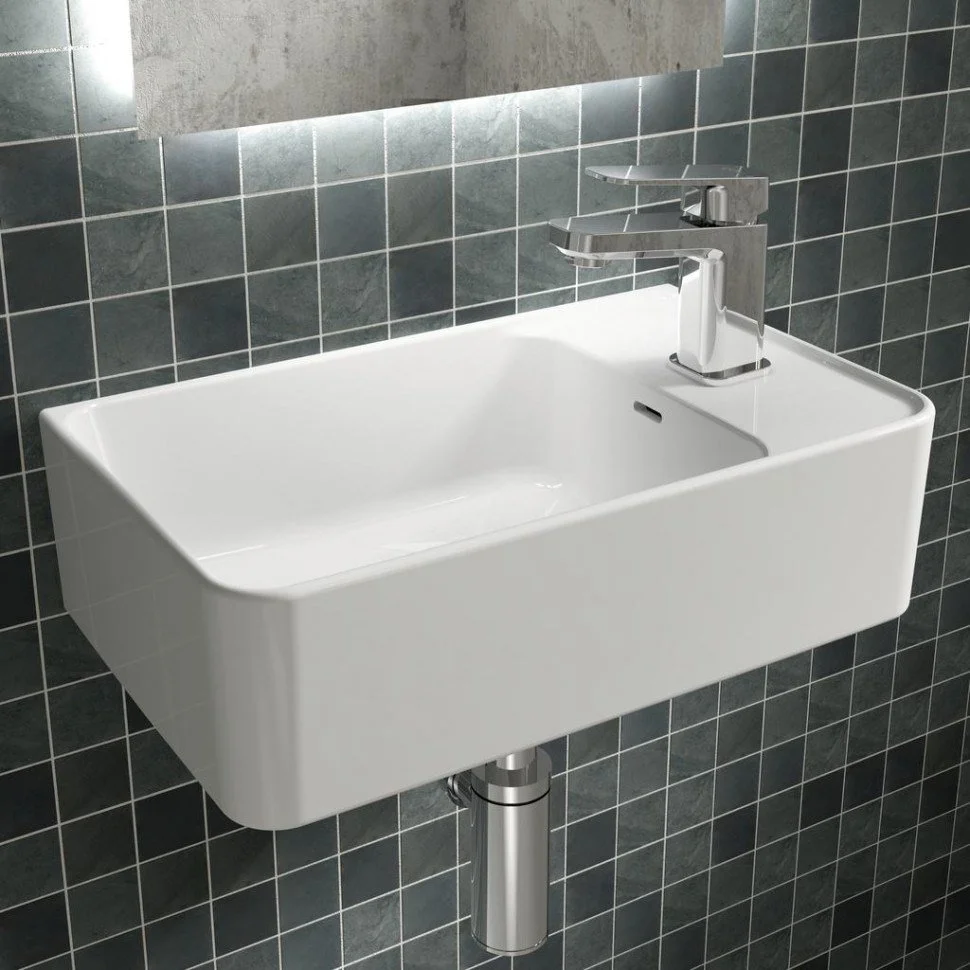 STRADA II Guest Асимметричный умывальник 45 см (платформа и отверстие под смеситель справа), для монтажа с дизайн-сифоном, с отверстием перелива (щелевого типа), с керамической накладкой слива (T854601), с крепежом TT0299699