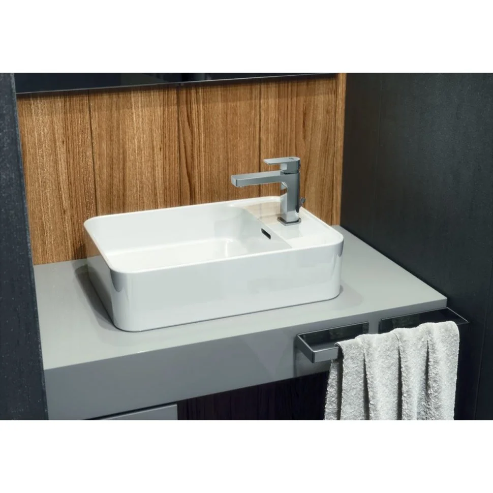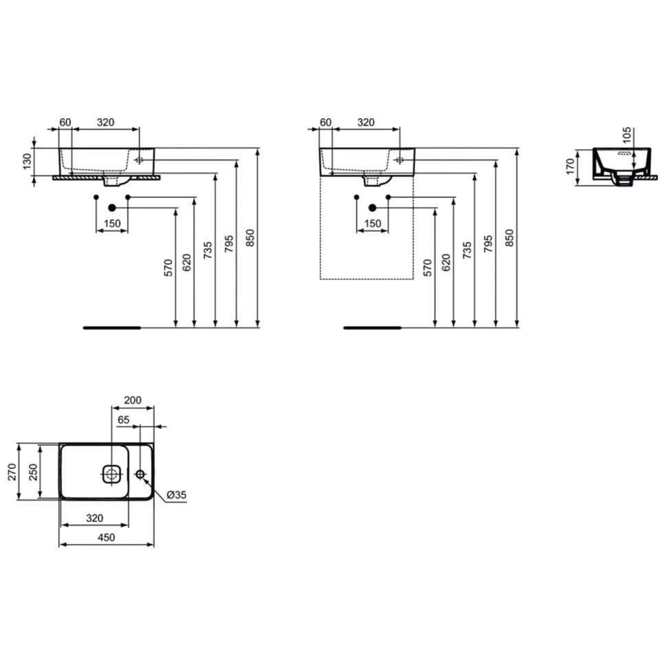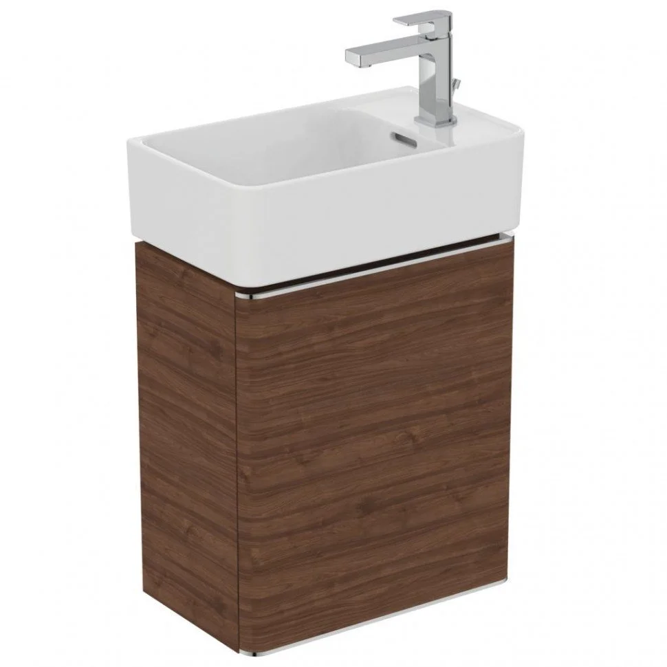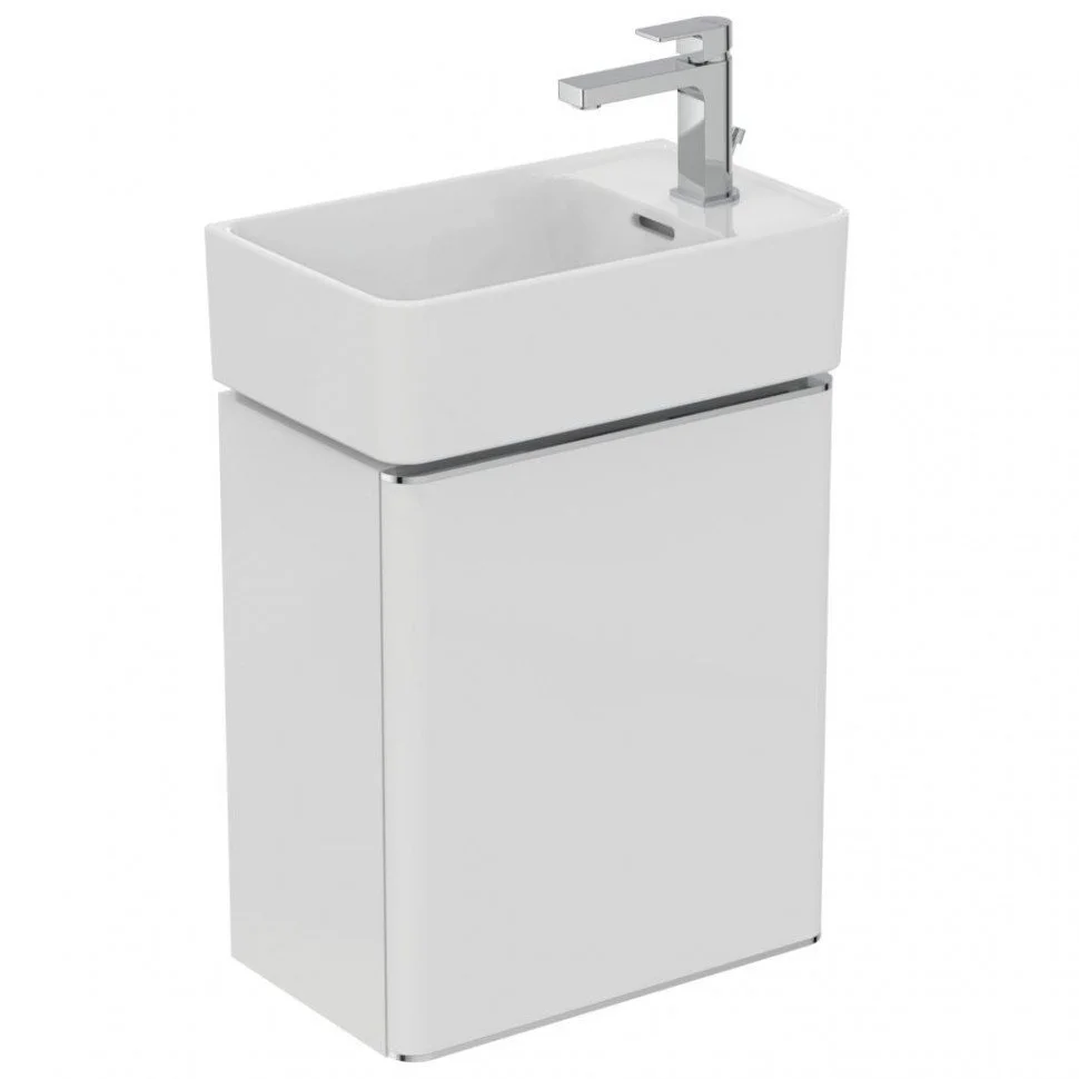 STRADA II Guest Асимметричный умывальник 45 см (платформа и отверстие под смеситель справа), для монтажа с дизайн-сифоном, с отверстием перелива (щелевого типа), с керамической накладкой слива (T854601), с крепежом TT0299699