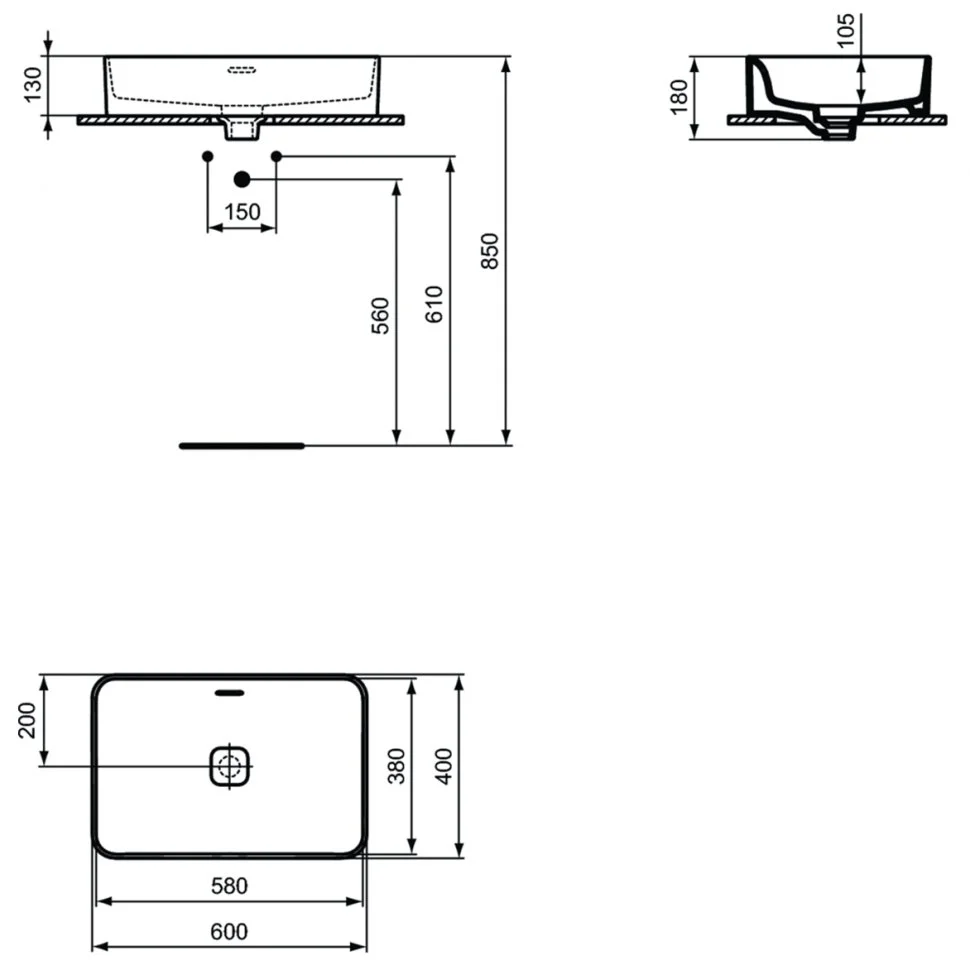 STRADA II Vessel Умывальник 60 см без отверстия под смеситель, для монтажа с мебелью, с отверстием перелива (щелевого типа), с керамической накладкой слива (T854601), с крепежом