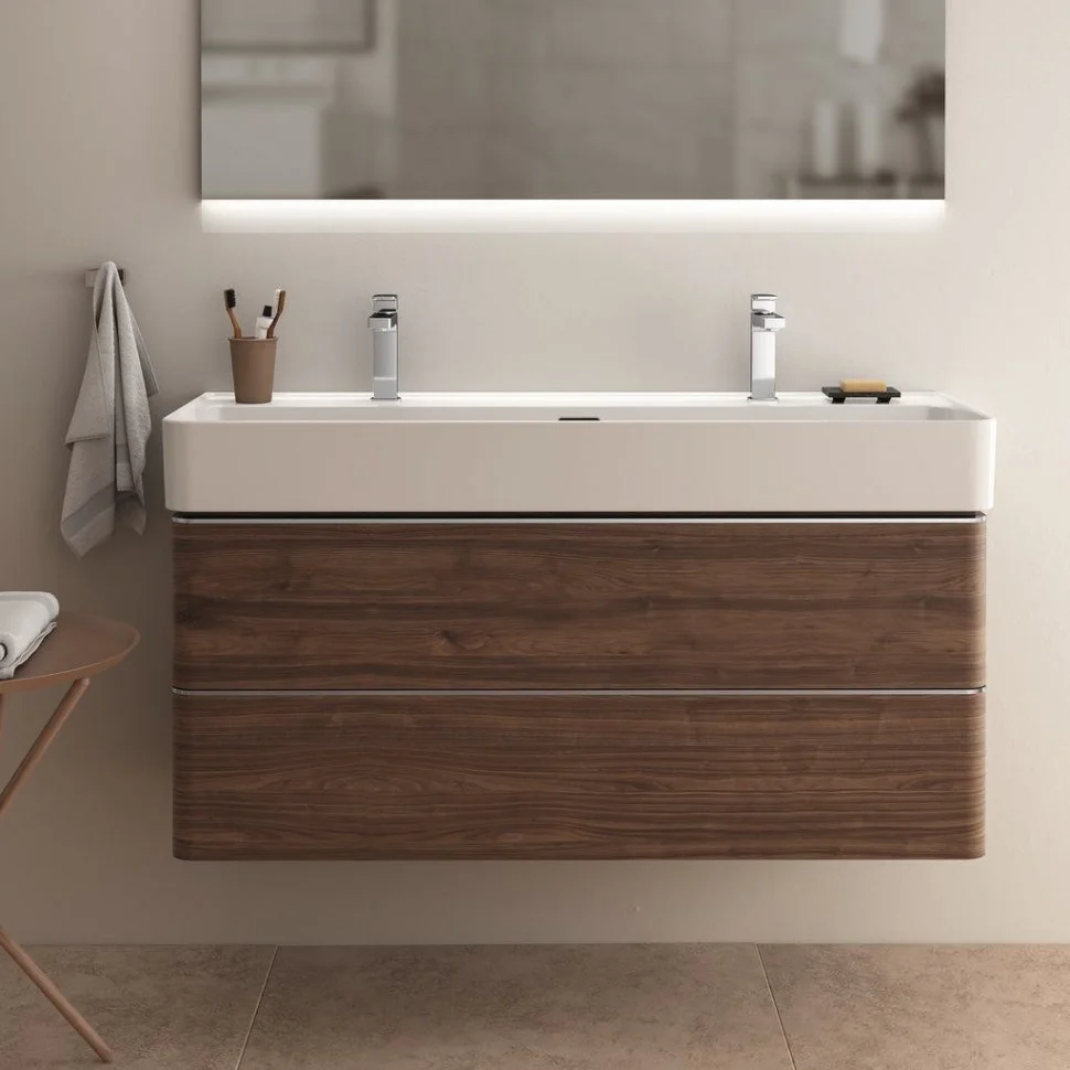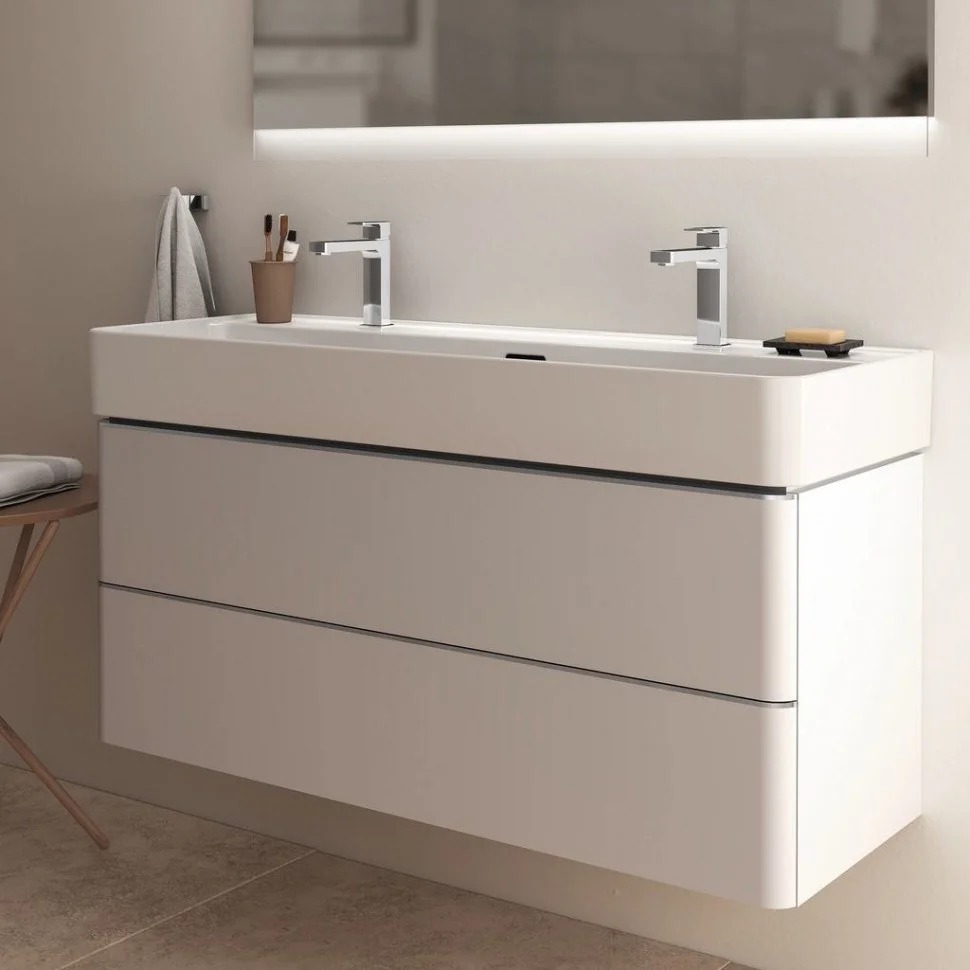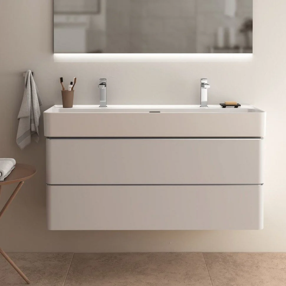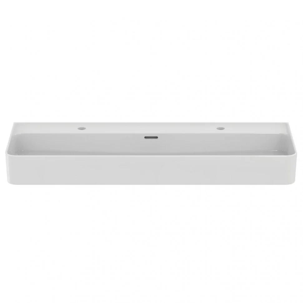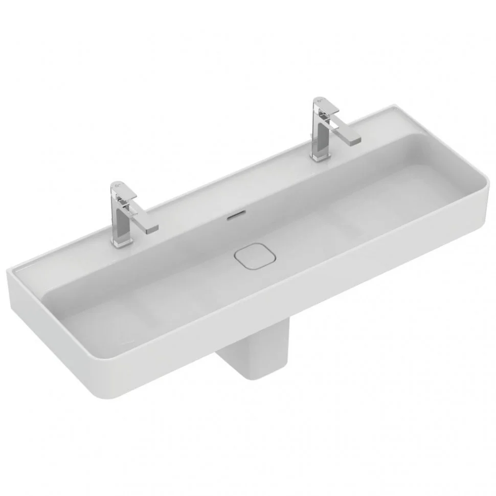 STRADA II Умывальник 120 см для монтажа с двумя смесителями, с 2-мя отверстиями под смесители, для монтажа с полуколонной или дизайн-сифоном, с отверстием перелива (щелевого типа), с керамической накладкой слива (T854601). Без крепежа