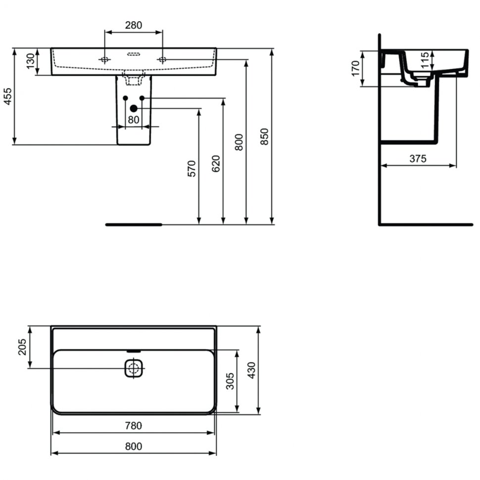 STRADA II Умывальник 80 см без отверстия под смеситель (для комбинации с настенным смесителем), для монтажа с полуколонной или дизайн-сифоном, с отверстием перелива (щелевого типа), с керамической накладкой слива (T854601). Без крепежа